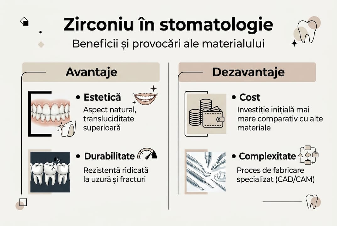 Orice decizie medicală bună se bazează pe o comparație corectă. Zirconiu are avantaje clare, dar și câteva limitări pe care trebuie să le cunoști.
