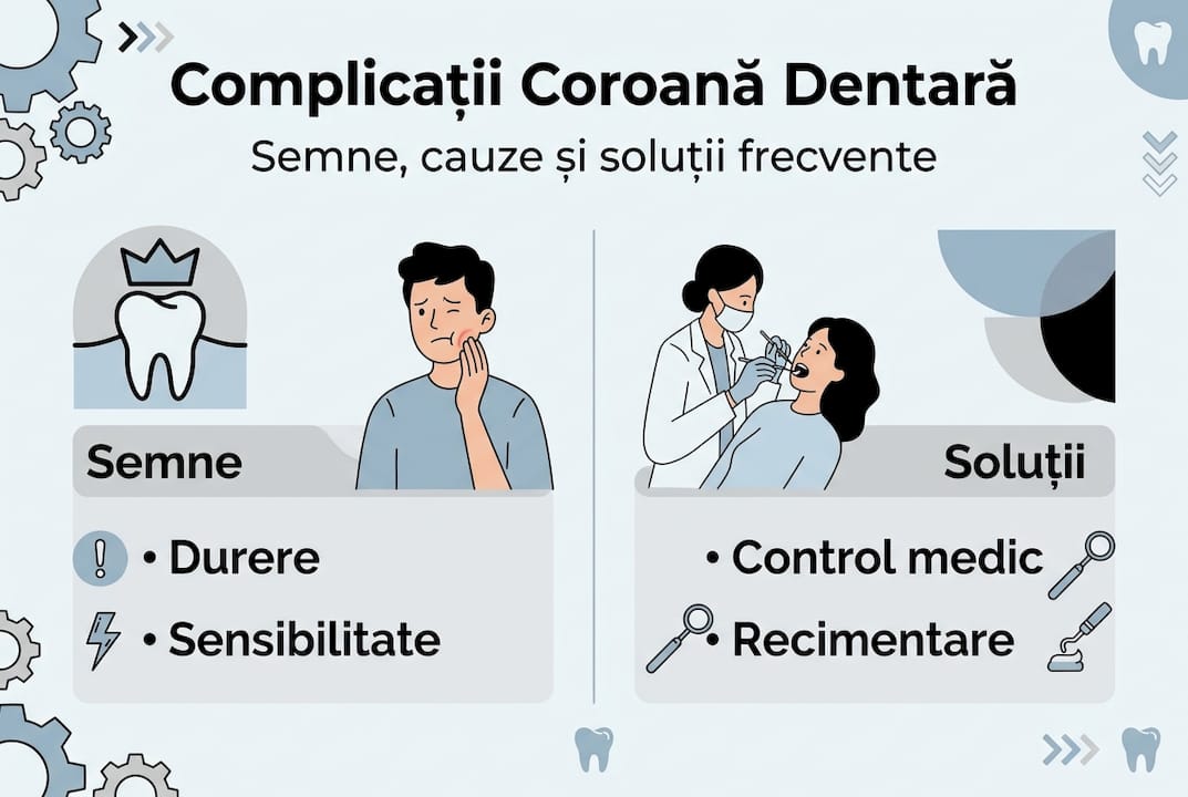 O coroană dentară nu înseamnă că problema s-a rezolvat definitiv. Mulți pacienți din București cred că, odată pusă coroana, nu mai au de ce să-și facă griji. Realitatea este alta: complicațiile după coroana dentară apar mai des decât s-ar crede, iar ignorarea primelor semne poate transforma un disconfort minor într-un tratament complex și costisitor. Acest ghid îți explică exact ce complicații pot apărea, de unde provin, cum le recunoști din timp și ce poți face concret pentru a le rezolva. Dacă simți ceva neobișnuit sub coroana ta, informațiile de mai jos îți pot economisi timp, bani și suferință.