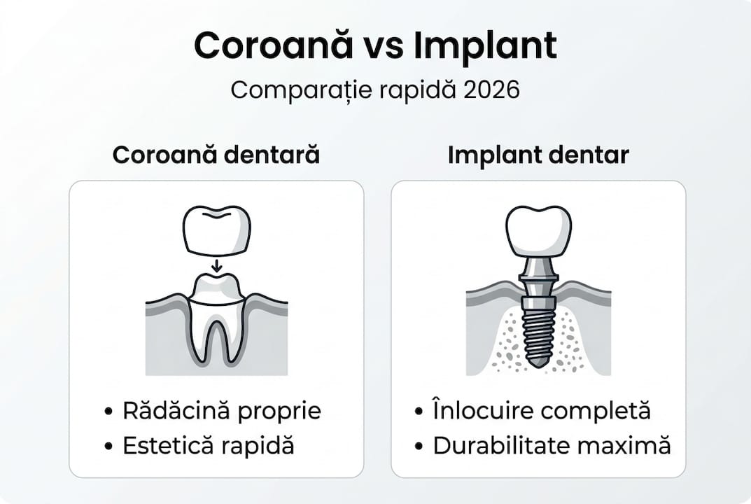 Coroana acoperă un dinte existent care are rădăcina intactă, iar implantul înlocuiește complet un dinte lipsă, inclusiv rădăcina artificială din titan. Sunt soluții complementare, nu concurente.