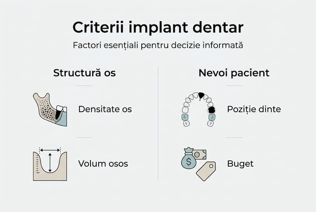 | Tipuri în funcție de os | Densitatea și volumul osului determină tipul de implant potrivit, fie standard din titan, fie miniimplanturi sau implanturi zigomatice. |