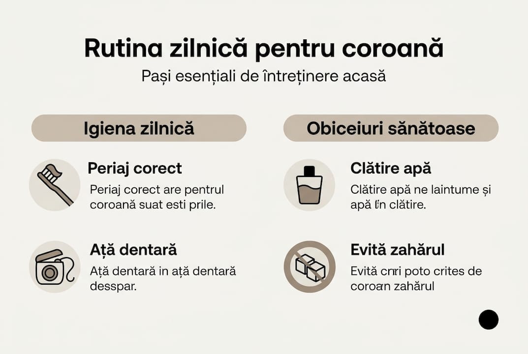 Pasta de dinți standard cu fluor și periuțele cu peri moi sau medii sunt perfect adecvate pentru curățarea coroanelor dentare. Evită pastele abrazive pentru albire intensivă care pot zgâria suprafața ceramicii în timp. Ața dentară clasică sau cu ceară funcționează excelent pentru curățarea spațiilor interdentare. Apele de gură fără alcool concentrat sunt preferate pentru utilizare zilnică pe termen lung, protejând atât coroana cât și țesuturile gingivale adiacente.