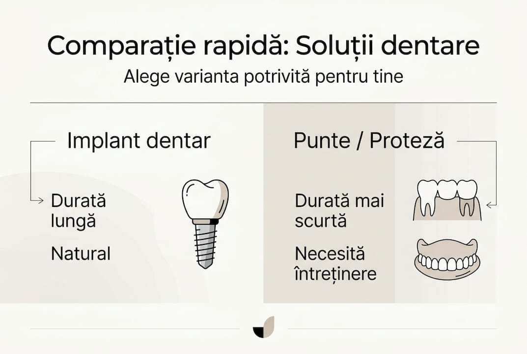Implantul dentar oferă cea mai bună stabilitate și durabilitate pe termen lung comparativ cu alternativele. Puntea dentară necesită șlefuirea dinților sănătoși vecini, ceea ce reprezintă un sacrificiu permanent. Proteza mobilă este mai accesibilă ca preț inițial, dar confortul și stabilitatea sunt inferioare.