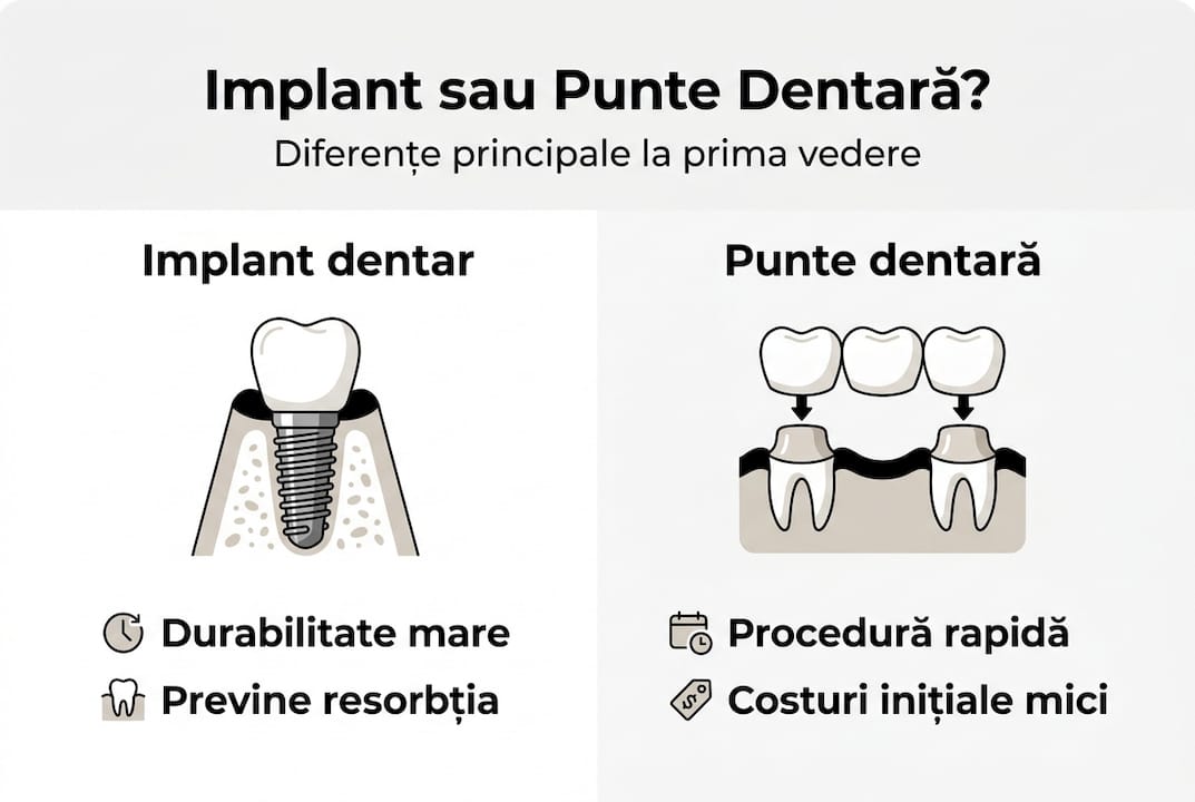 Pierderea unui dinte nu este doar o problemă estetică. Resorbția osoasă crește cu 25-40% în primul an fără înlocuire, ceea ce înseamnă că osul maxilar se retrage vizibil și rapid. Mulți bucureșteni care se confruntă cu un dinte lipsă nu știu că alegerea dintre implant și punte dentară influențează nu doar aspectul zâmbetului, ci și sănătatea pe termen lung a întregii guri. Acest articol îți explică clar diferențele, avantajele și dezavantajele fiecărei soluții, astfel încât să poți lua o decizie informată împreună cu medicul tău stomatolog.