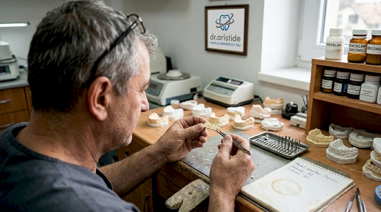 Implantul dentar înlocuiește rădăcina și coroana printr-un șurub din titan sau zirconiu inserat chirurgical în osul maxilar. Procesul implică mai multe etape: inserarea șurubului, o perioadă de osteointegrare (adică fuziunea implantului cu osul) de 3 până la 6 luni, și apoi montarea coroanei definitive. Poți citi mai multe despre implantul dentar explicat dacă vrei să înțelegi fiecare etapă în detaliu.