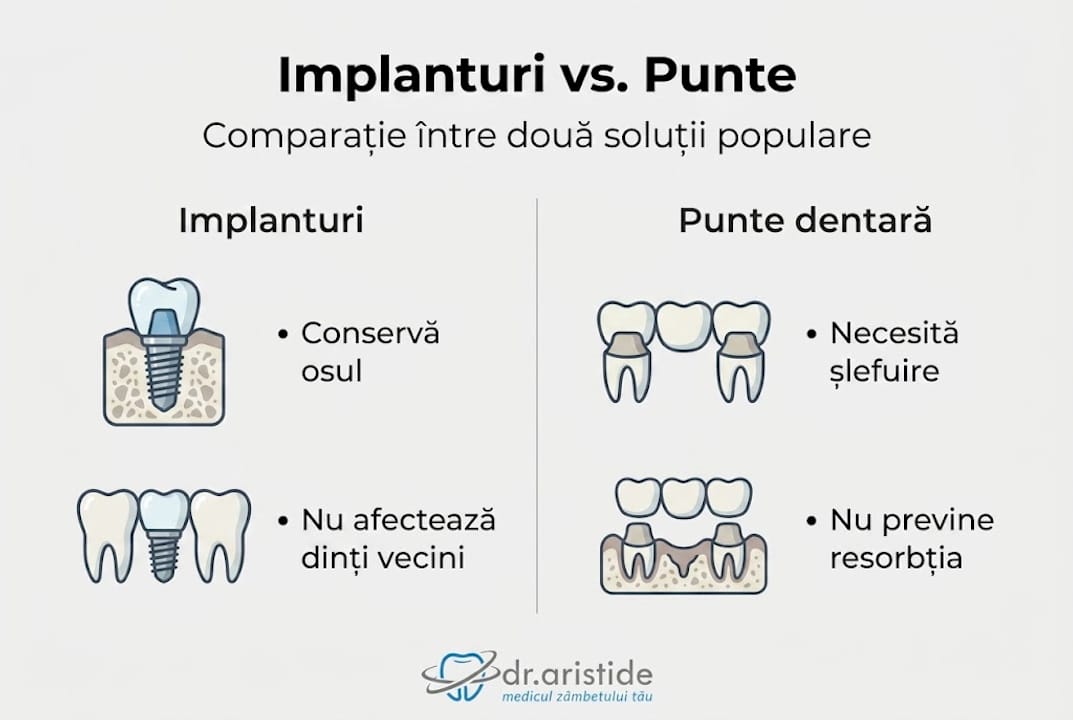 Diferențele cheie între implanturi și punți sunt clare: implant vs. punte dentară arată că puntea necesită sacrificarea dinților vecini sănătoși, ceea ce poate duce la complicații ulterioare. Pe termen lung, implantul este mai economic și mai sănătos.