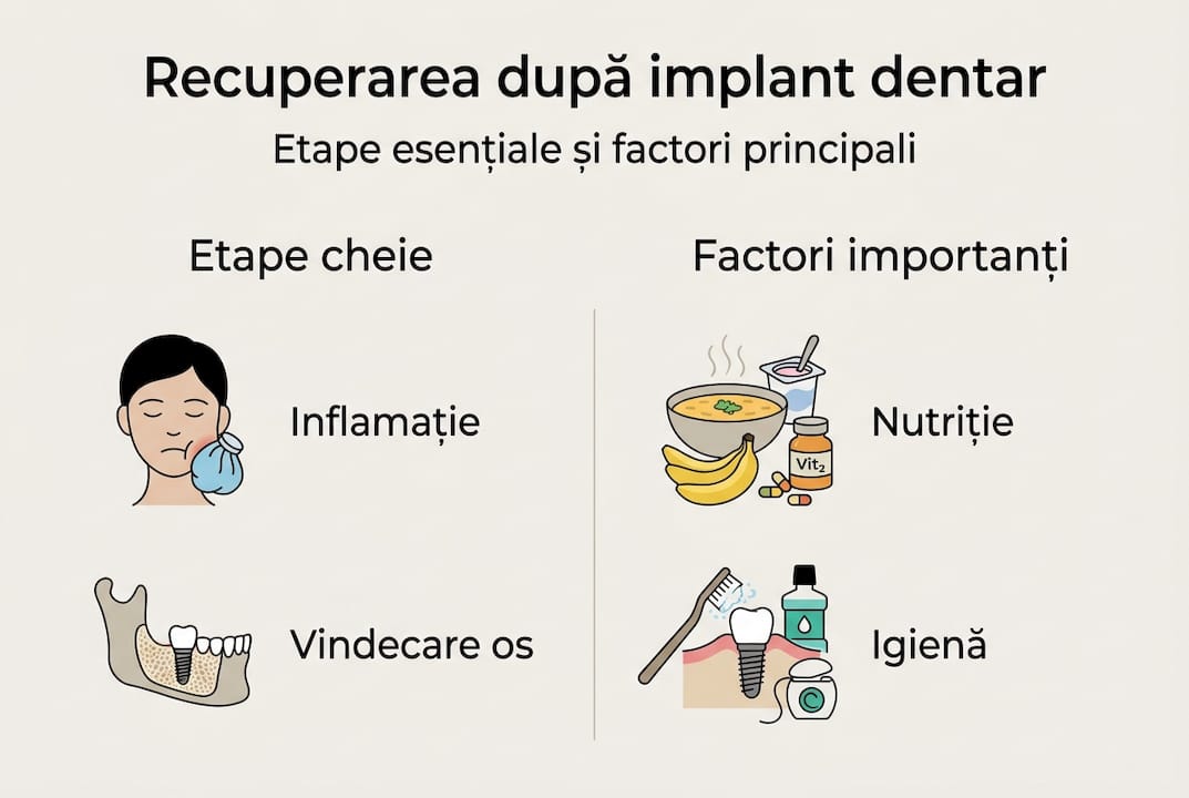 Conform informațiilor medicale validate, recuperarea post-implant include primele 24-48 de ore cu sângerare ușoară, umflături și disconfort, urmată de prima săptămână în care inflamația se reduce treptat, și o perioadă de 2 până la 6 luni dedicată osteointegrării. Fiecare fază are rolul ei bine definit.