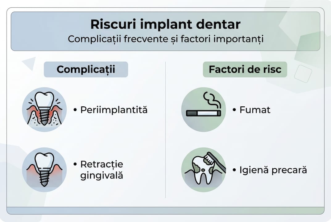 - Implantul dentar prezintă riscuri precum periimplantita, retracția gingivală și fracturile, unele putând duce la pierderea implantului. Periimplantita afectează până la 20% dintre pacienți și evoluează lent, fiind influențată de igienă și factori precum fumatul. Menținerea unei igiene riguroase și controlul periodic la medic reduc semnificativ riscurile asupra sănătății implantului.