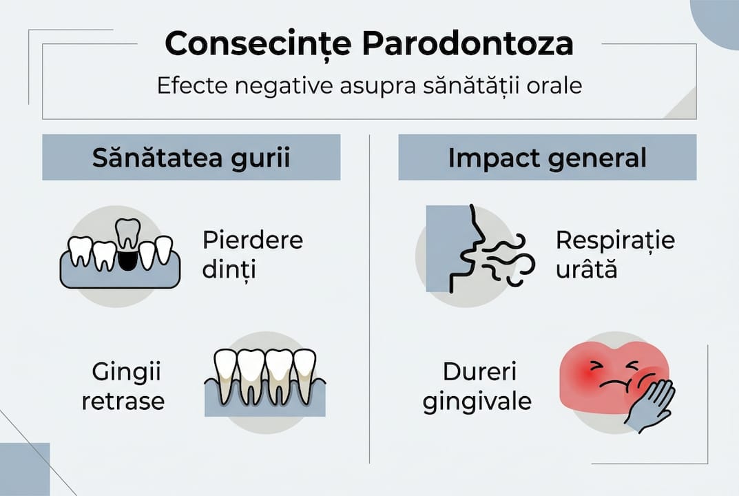 Consecinţele netratării parodontozei pot fi devastatoare pentru sănătatea orală. Pierderea dinților afectează nu doar estetica zâmbetului, ci și funcția masticatorie, pronunția și chiar starea emoțională a pacientului. Studiile arată că parodontoza avansată poate influența negativ și sănătatea generală, fiind asociată cu boli cardiovasculare și diabet zaharat. Diagnosticarea rapidă prin examinare clinică și radiografii permite implementarea unui plan de tratament eficient care poate salva dinții și restabili sănătatea gingivală.